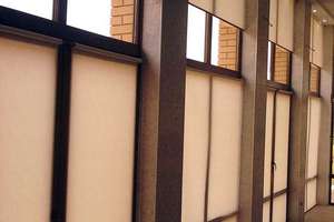 Когда необходимо не просто приглушить световой поток, а блокировать его полностью, попутно оградив помещение от посторонних глаз, тогда в солнцезащитных системах используется специальная светонепроницаемая ткань - блэкаут.